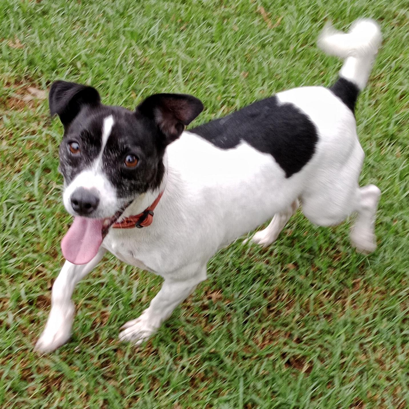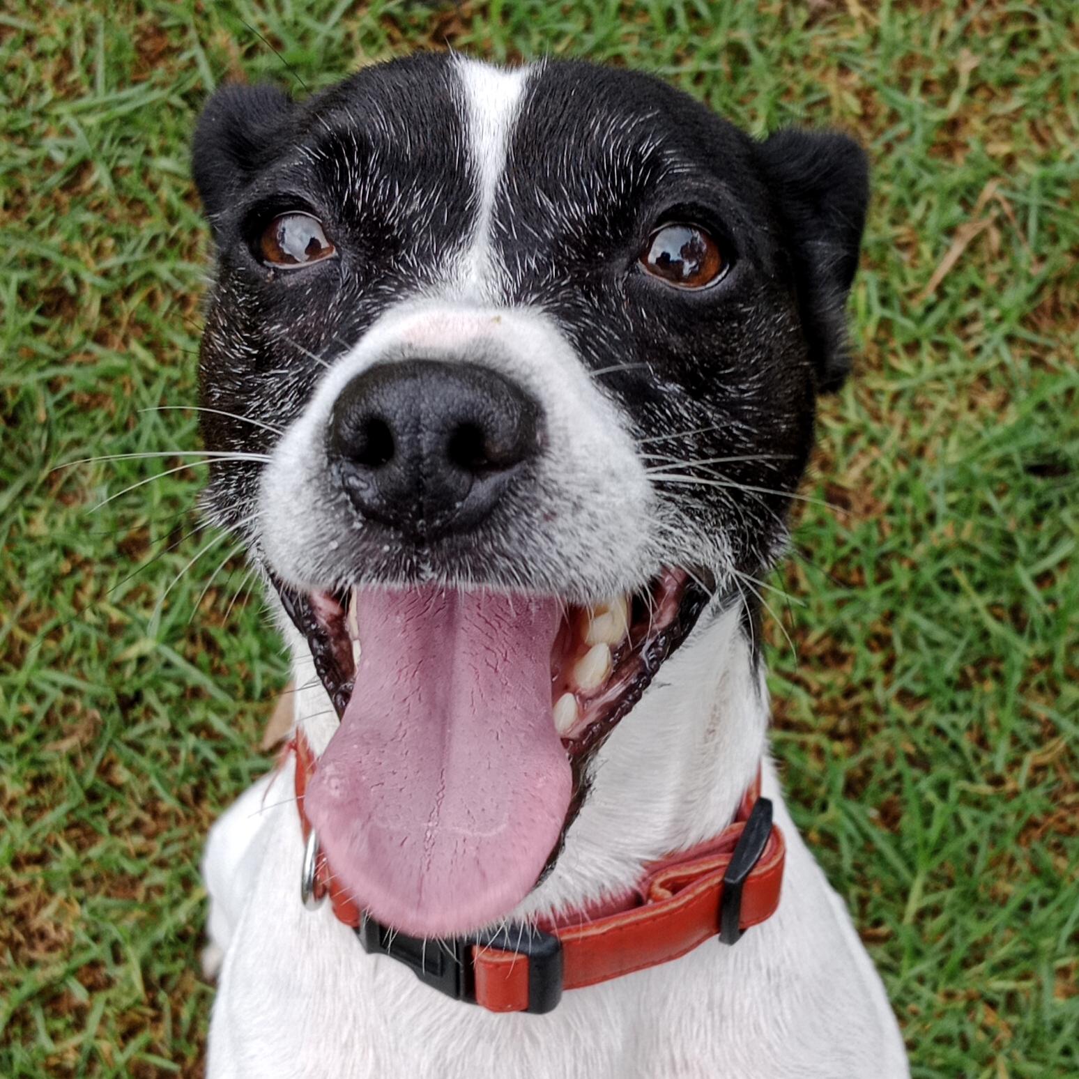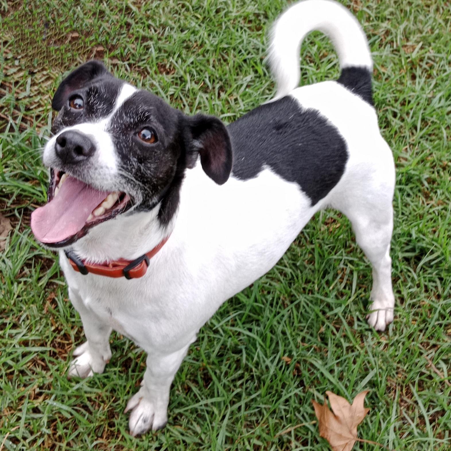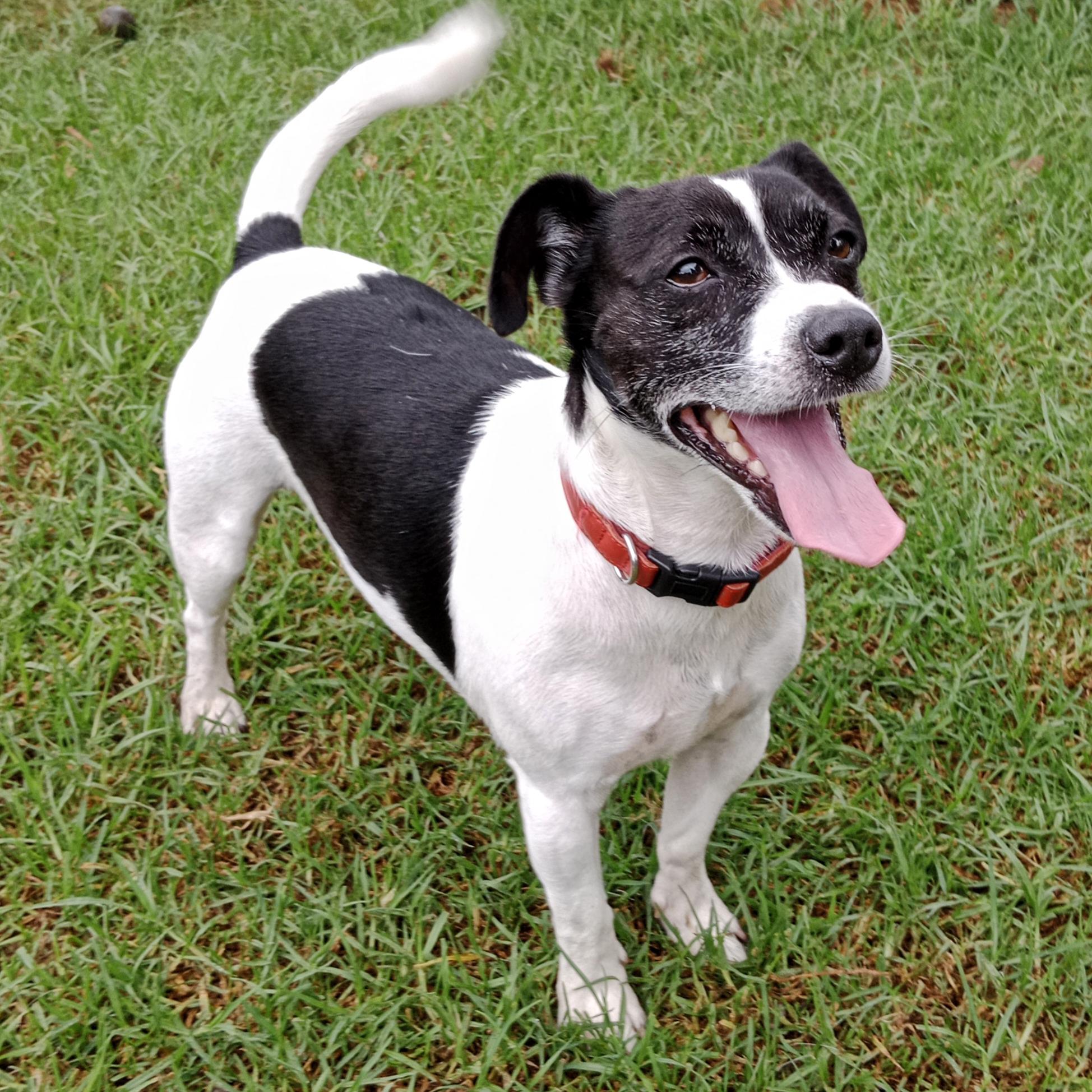Arnie is a solid, smooth coat, black and white male JR mix aged 6yrs.
